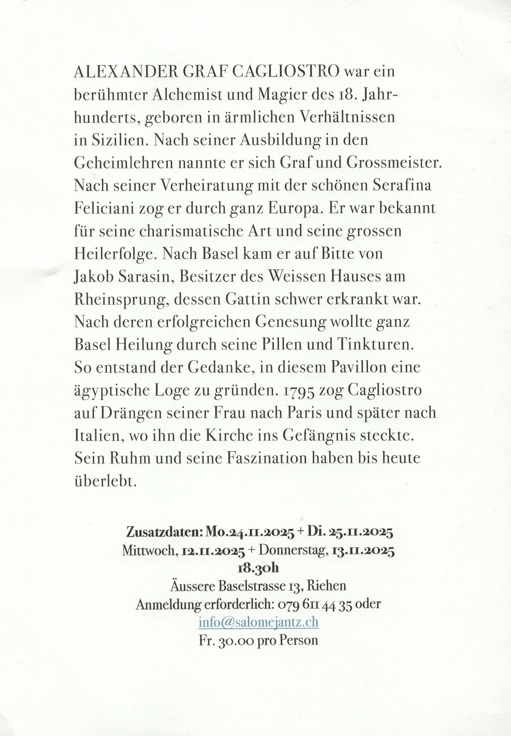 Sensationell gespielt, lehrreich und unterhaltsam — das ist «Cagliostro - Seine Séancen und Tinkturen» von Jantz & Bröckelmann im prächtigen historischen Cagliostro-Pavillon. Das Stück läuft noch am 13., 24. und 25. November 2025. Und pssst — es habe sogar noch ein paar freie Plätze. Anmeldungen bitte direkt per E-Mail an Salomé Jantz (siehe nachfolgenden Flyer).