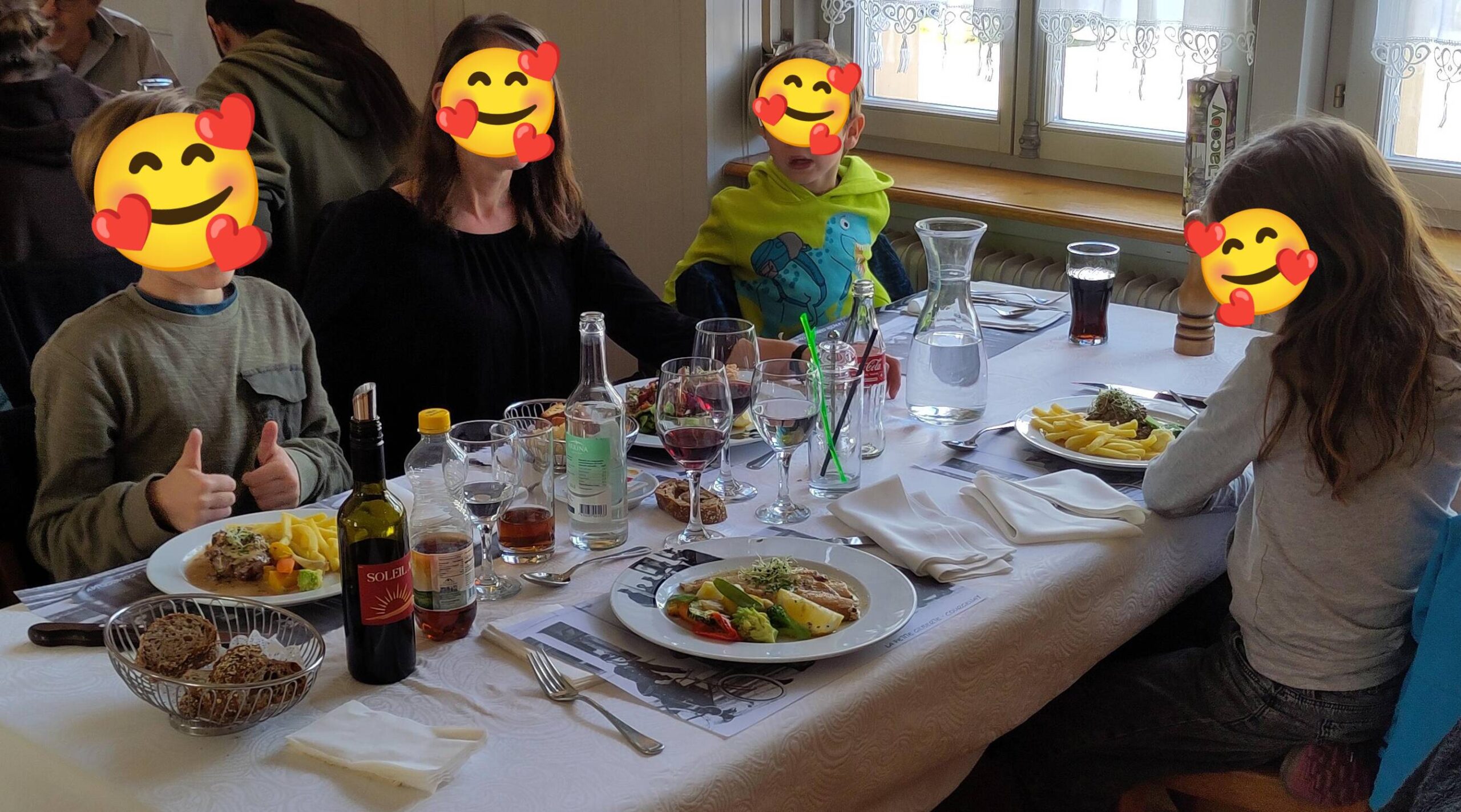 Ein offensichtlicher Grund, den Bernasconis in Courgenay (endlich) mal einen Besuch abzustatten. So genossen wir letzten Sonntag ein wunderbares Mittagessen in La Petite Gilberte. Vom «Filet de boeuf au beurre et herbes avec sauce morilles» bis zu den «Filets de truite du Doubs meunière» liess das Menü wirklich keinerlei Wünsche offen. Unsere drei Kinder liessen sich gar ein «Bestes Restaurant, in dem wir je waren!» entlocken. Kindermund tut Wahrheit kund.